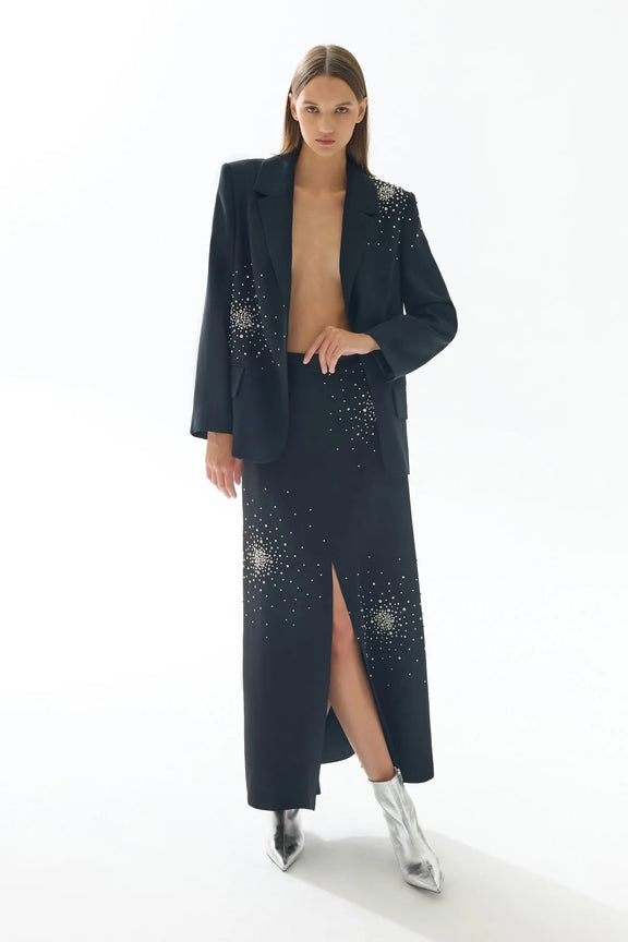 - Skirt: High waist, stone-embroidered and slit on the front, long skirt.