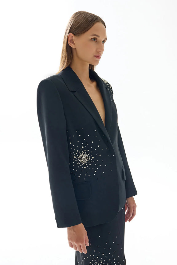 Jacket: One shoulder and one side of the front are stone embroidered, turned collar, open front.