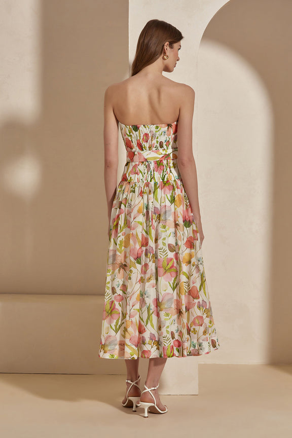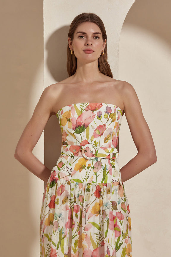 Paula Dress combines simplicity and elegance with its strapless design. While the floral patterned midi dress gains elegance with the fabric belt at the waist, the back gipe detail makes it easier to wear.