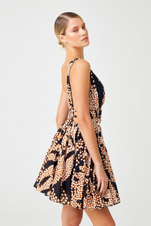 Deep V-neck, patterned, low-cut back, gathered waist, waist with string stripe, ruffles, multicolored, mini dress.